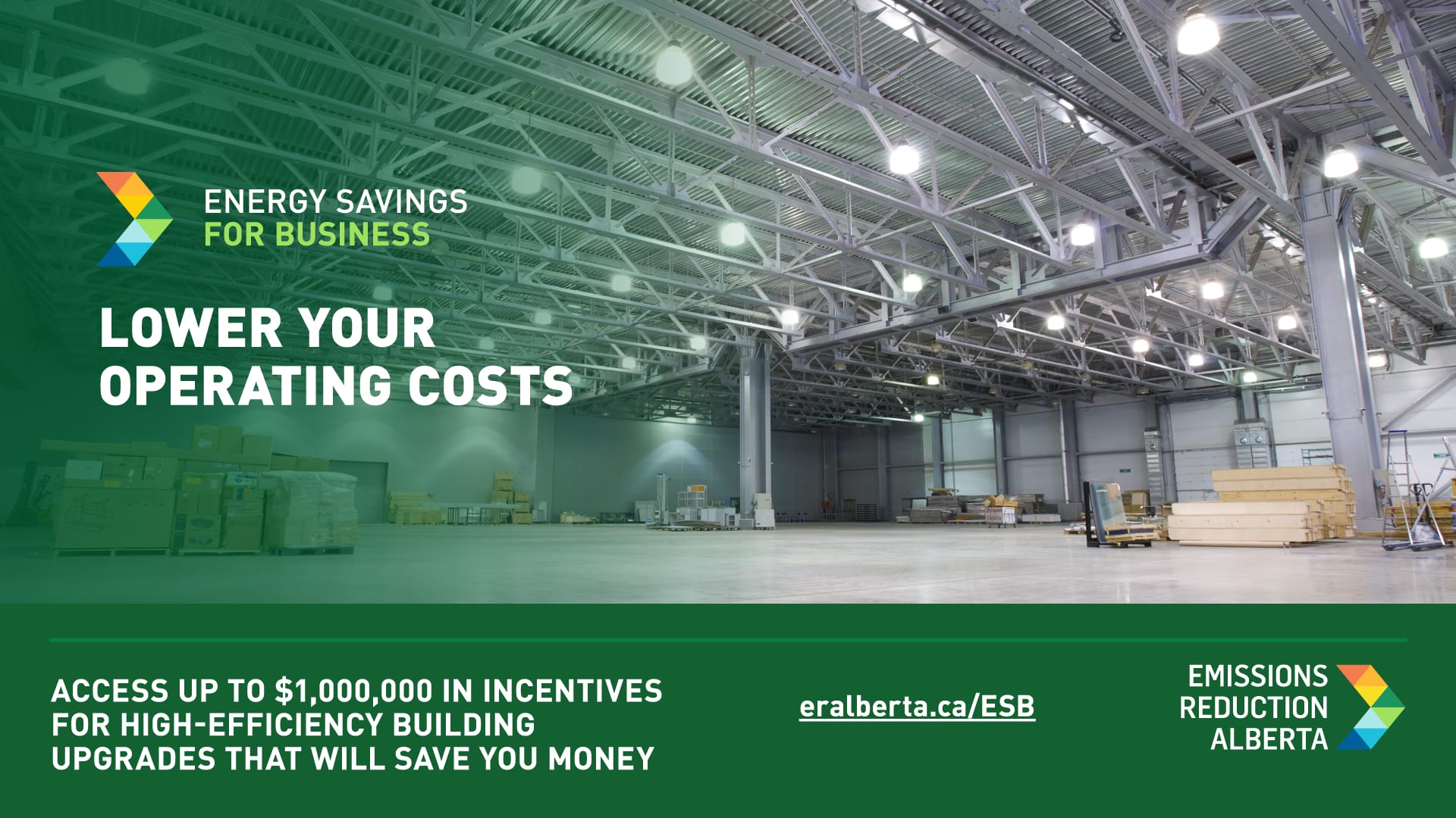 ESB is helping Alberta’s businesses decrease operating costs, grow their operations, and become more competitive, while reducing emissions, creating skilled jobs and boosting economic recovery. Businesses can receive fast access to up to $1 million in incentives for a wide range of high efficiency technologies like lighting and HVAC, thanks to the program’s streamlined application process.