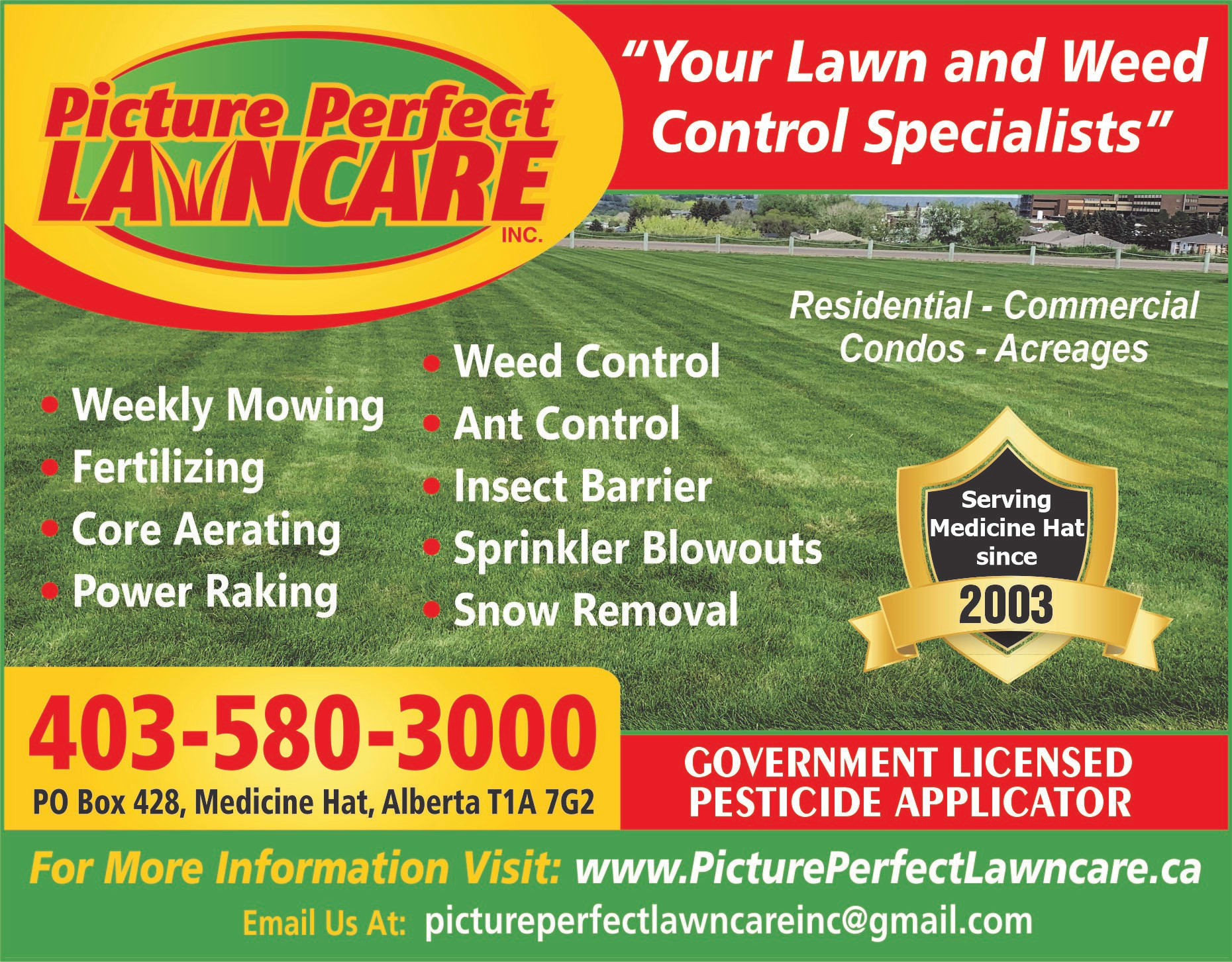 Picture Perfect Lawncare is a locally owned and operated and has been providing superior lawn maintanence services to residents in Medicine Hat and area since 2003. Over the years we have mastered the art of providing high quality lawn service that will please even the most discriminating client. We offer reliable and efficient services to residential and commerical properties, condominiums and acerages.